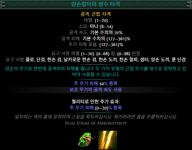 공격 속도가 빠른 무기이므로, 플랫 데미지를 제공하는 스킬이나 보조젬과의 궁합도 좋은 편입니다.
