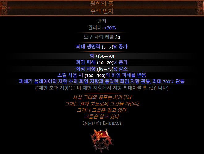 원한의 품은 화염 저항이 감소하는 패널티 대신 화염 관통을 대폭 획득할 수 있는 패널티 아이템입니다.