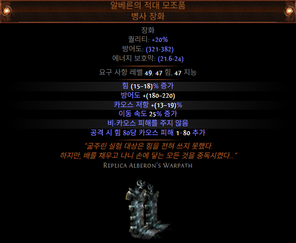 힘 1600 기준 20~1600 카오스 피해를 추가하므로 상당한 플랫 데미지를 제공합니다.
