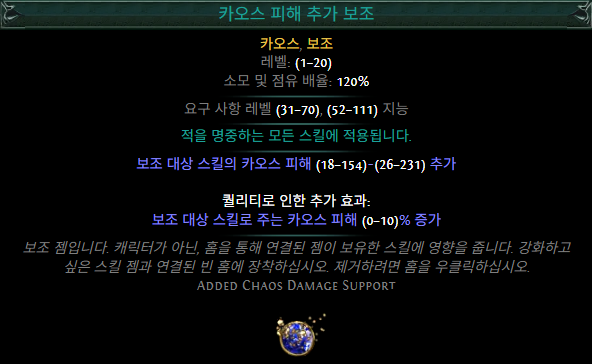 장착된 젬에 29레벨 카오스 피해 추가 보조를 적용합니다.